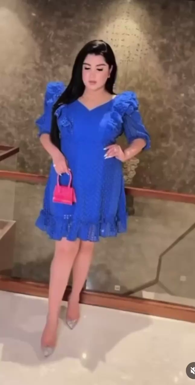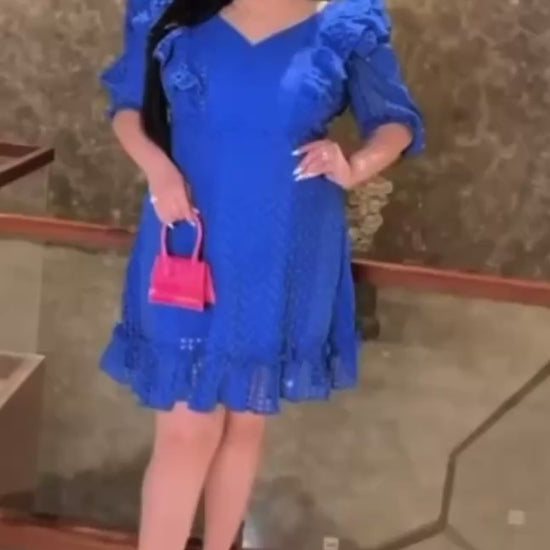 A striking royal blue ruffled dress with textured fabric, voluminous sleeves, and playful hemline, exuding elegance and charm. Perfectly styled with sparkling heels and a chic mini bag for standout sophistication.